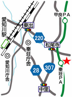 近江鉄道本線愛知川駅を出て北へ約120m行った所の交差点を右折し、県道28号線を東へ約6.8km行った所の中里の交差点を左折し、国道307号線を約3.7q行った所の松尾寺の交差点を右折し道なりに約500m進んだ所