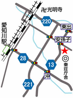 近江鉄道本線愛知川駅を出て北へ約120m行った所を右折し、県道28号線を東へ約2.5km行った所の沖の交差点を左折し、県道13号線を北へ約1km行った所のY字路を右方向に進み秦荘庁舎をすぎてすぐの左側