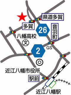 JR近江八幡駅西口を出てすぐの駅前の交差点を右折し、約1kmの所の交差点を左折し、県道26号線を約1.6kmの所、県道多賀の交差点を左折し、約100mの所近江兄弟社学園前の多賀の交差点を右折し、約100mの所の右側