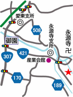 国道307号線・国道421号線の御園の交差点より東に直進し、約6qの所を斜めに右折し道なりに約200m行った所
