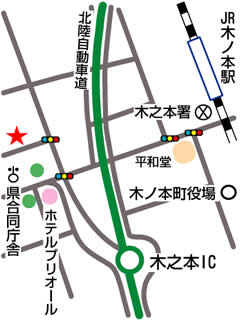 JR木之本駅を西に出て国道8号線を約650m行った交差点を右折し国道365号線の次の交差点を左折し、少し行った右側