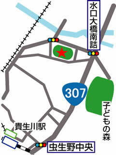 JR草津線・貴生川駅を出て北東に約200m行き、T字路を右折して南東に約400m行った虫生野中央の信号を左折し北東に約1.3km道なりに行き、水口大橋南詰の信号を左折した所の左側