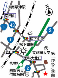 JR南草津駅東口を出て突き当たりの西友を左折し、国道1号線の野路の交差点を右折し、道なりに約300m、南田山の信号を左折し約1.3Km、松下中央の信号を右折し約300m、笠山の信号を左折し約1.5Km、福祉センター口の信号を左折し約150m行った所(福祉センターのとなり)