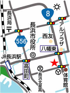 JR長浜駅を出て東に約1.9km行き、八幡東の交差点を右折し国道8号線を南に約500m行った所の右側