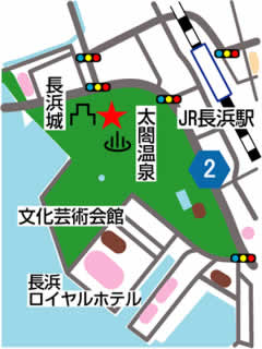 JR長浜駅を出てすぐ左折し(線路を越え)約400m行き、公園町の交差点を左折してすぐのT字路を左折し県道2号線を南に約600m行き、港町の交差点を右折した所の豊公園内(長浜城の横)