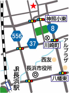 JR長浜駅を出て東に約1.9km行き、八幡東の交差点を左折し国道8号線を北に約2.3Km行き、神照の交差点を右折して約500m行き、十字路を右折し約100m行った所