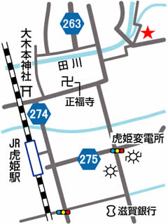 JR虎姫駅の前の県道274号線を北へ約250m行った所のT字路を右折して東へ約500m行き、突き当たりのT字路を左折して北へ約100m行き川の手前の道を右折して、西へ約500m行った所の左側