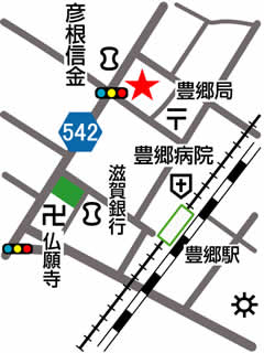 近江鉄道豊郷駅を出て直進し、250m行った所のT字路を右折し、県道542号線を200m行った所の右側